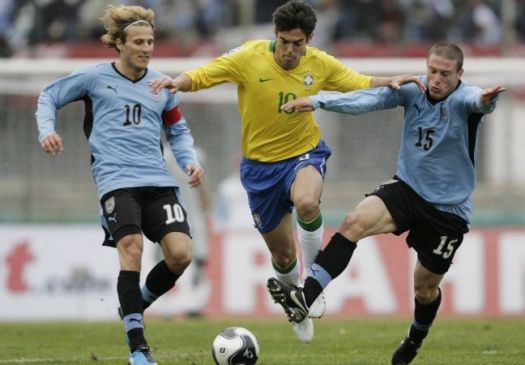 Kaká tenta passar por dois uruguaios durante jogo pelas eliminatórias sul-americanas para a Copa de 2010.